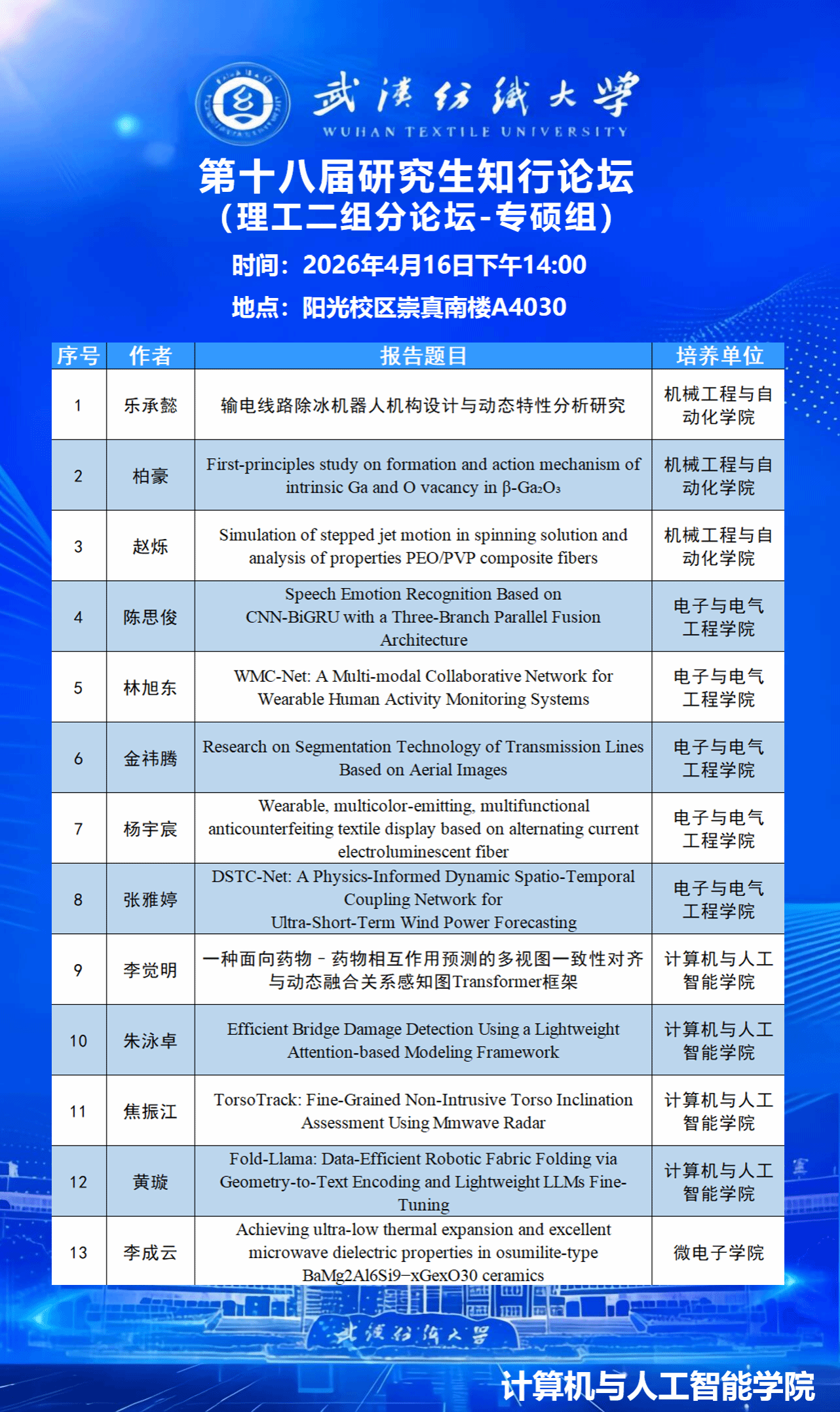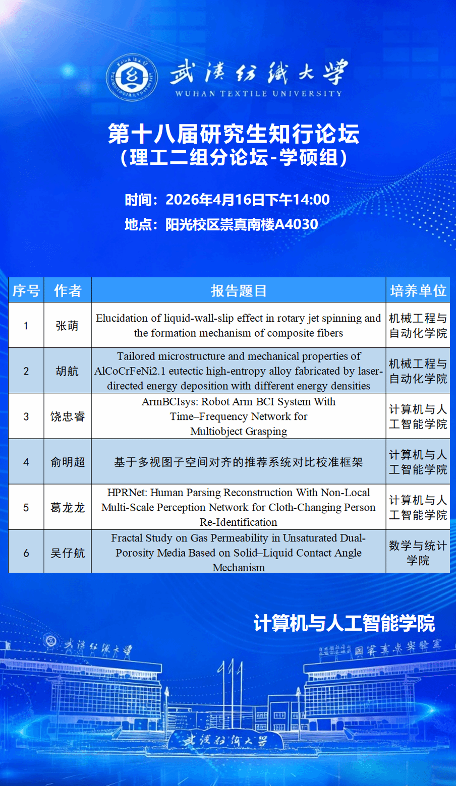 学术预告:williamhill官网第十八届研究生知行论坛理工二组分论坛——第1119期研究生学术论坛暨计算机与人工智能学院2026年第6期研究生学术论坛