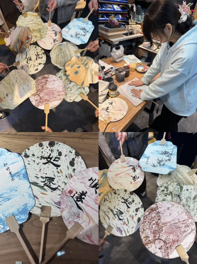 活动伊始,大家围坐在长桌前,在专业老师指导下,将天然大漆稀释,调入矿物颜料,在清水中晕染出多彩绚烂花纹,随后绢面竹扇以特定角度浸入水面,瞬息万变的色彩霎那间定格为独一无二的春色画卷。选材、上色、打磨,专注于当下时刻,在承载着春日私语的扇面中,捕捉到属于自己的理想色彩。