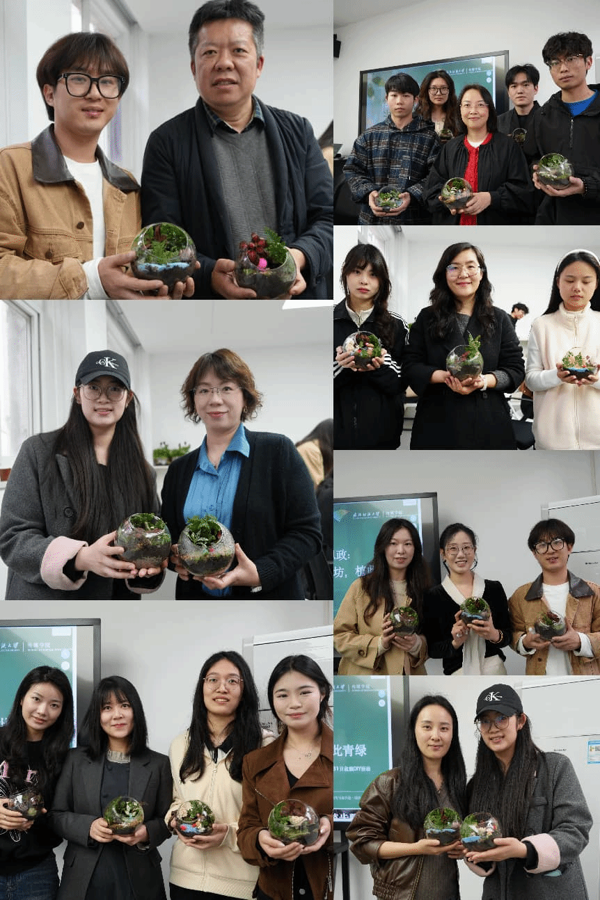 创作过程中,师生围坐一堂,边创作边交流,创意灵感不断迸发。有的作品以宁静田园为灵感,用迷你小屋、栅栏与蜿蜒白径营造出诗意角落;有的以江南庭院为意象,借小桥、流水造型与疏密绿植复刻中式园林风情;还有的以童话森林为主题,将形态各异的绿植与可爱摆件巧妙组合,层次错落间尽显童真意趣。导师们放下平日严谨的科研姿态,与学生们并肩创作,在轻松协作中倾听心声、传递鼓励;学生们也在互动中敞开心扉,将科研困惑与生活感悟与导师真诚交流。有的以“绿水青山”隐喻可持续发展理念,有的借“枯木逢春”探讨逆境成长,让思政元素化为可触可感的艺术表达,欢声笑语间,导学关系从“学术指导”悄然走向“亦师亦友”。
