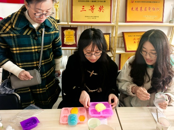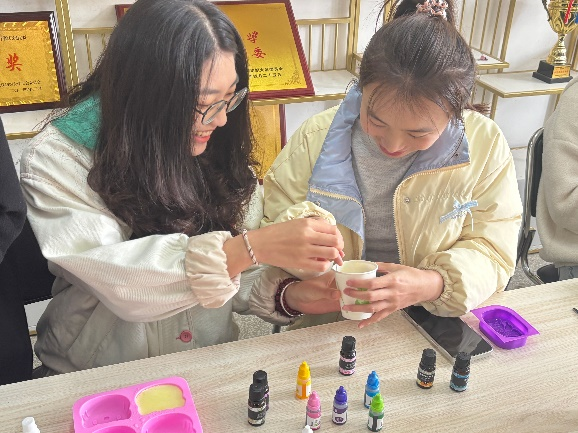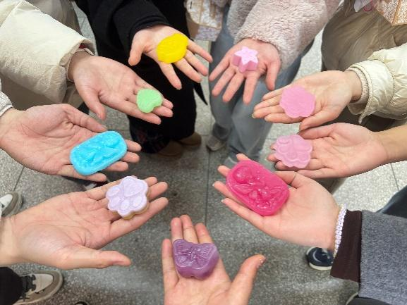 活动伊始,主持人详细介绍手工皂的制作流程和注意事项,并展示了各种造型精美、色彩缤纷的香皂样品,激发大家的创作热情。在轻松愉快的氛围中,师生们纷纷化身“手工达人”,将精油、干花、色素等材料融入皂基中,发挥创意,精心制作出独一无二的手工香皂。在制作过程中,大家相互交流心得,分享创意,现场气氛热烈而温馨。活动结束后,同学们将自己亲手制作的手工皂送给导师们,并送上最真诚的祝福。研究生黄丽娟开心分享道:“这个活动特别的有趣,而且和老师一起创作,很有意义和纪念价值。”